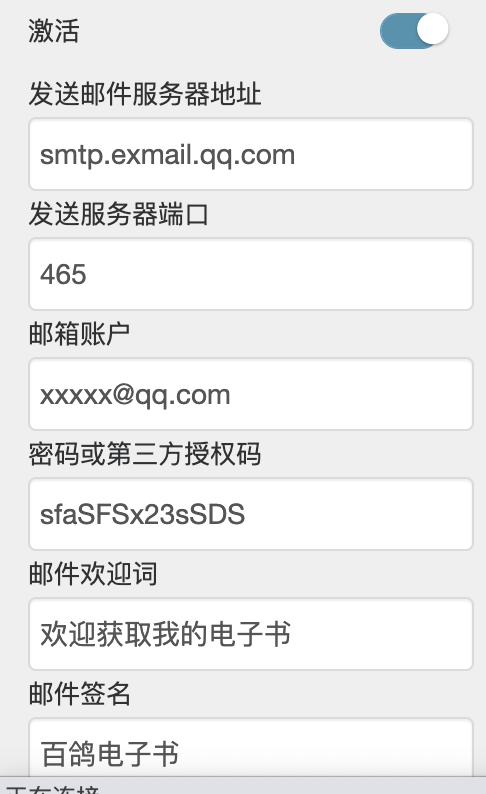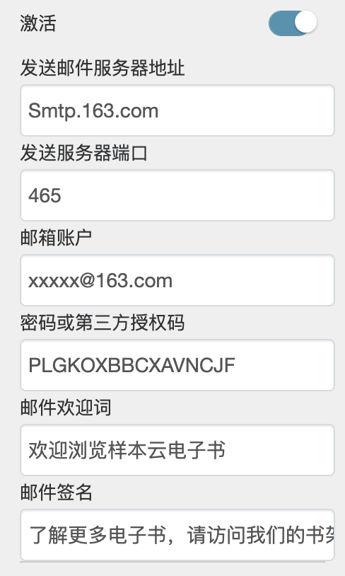 您可以访问电子书的“预览配置”页,找到"邮件分发"项,该配置与邮箱客户端一致,如果您使用163或qq邮箱,需要输入第三方登录授权码